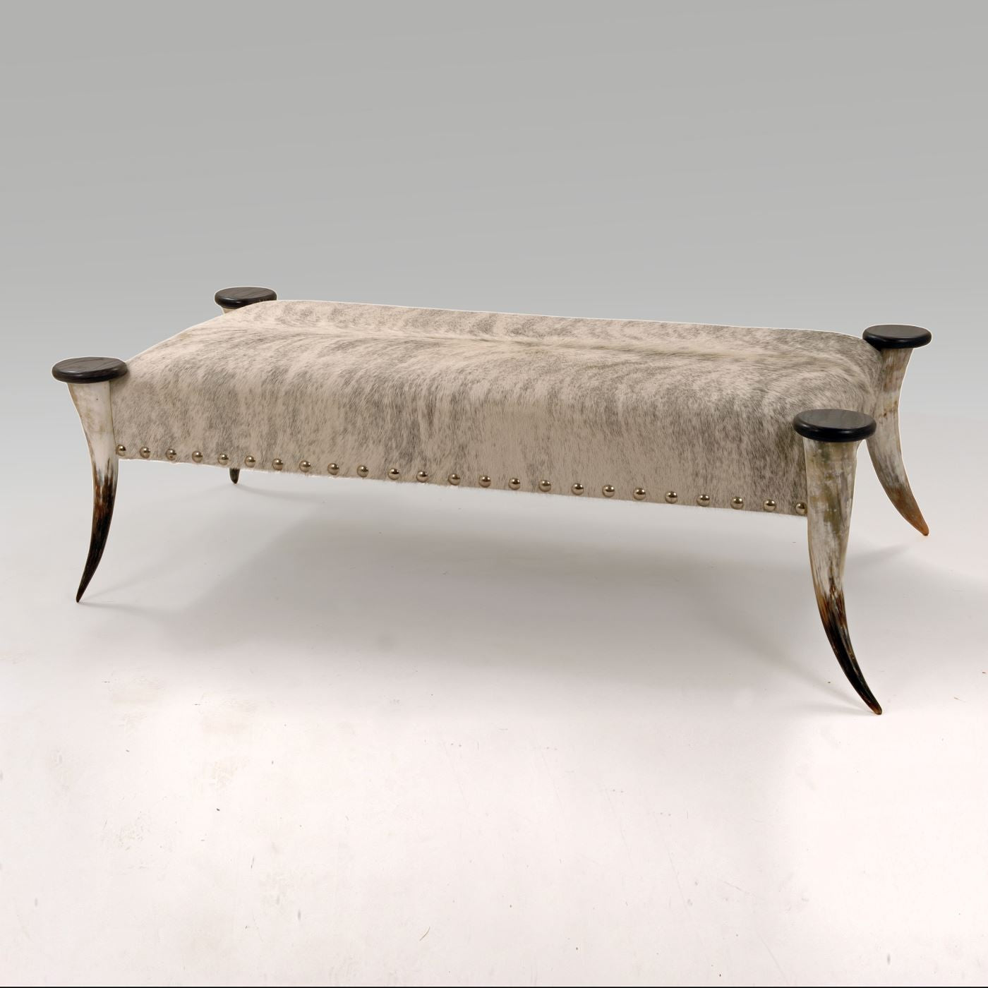 The grey cowhide upholstery complements the beautiful colour of the cow horn legs on this unusual stool. If grey cowhide isn't available, this stool can be covered in any fabric or leather.