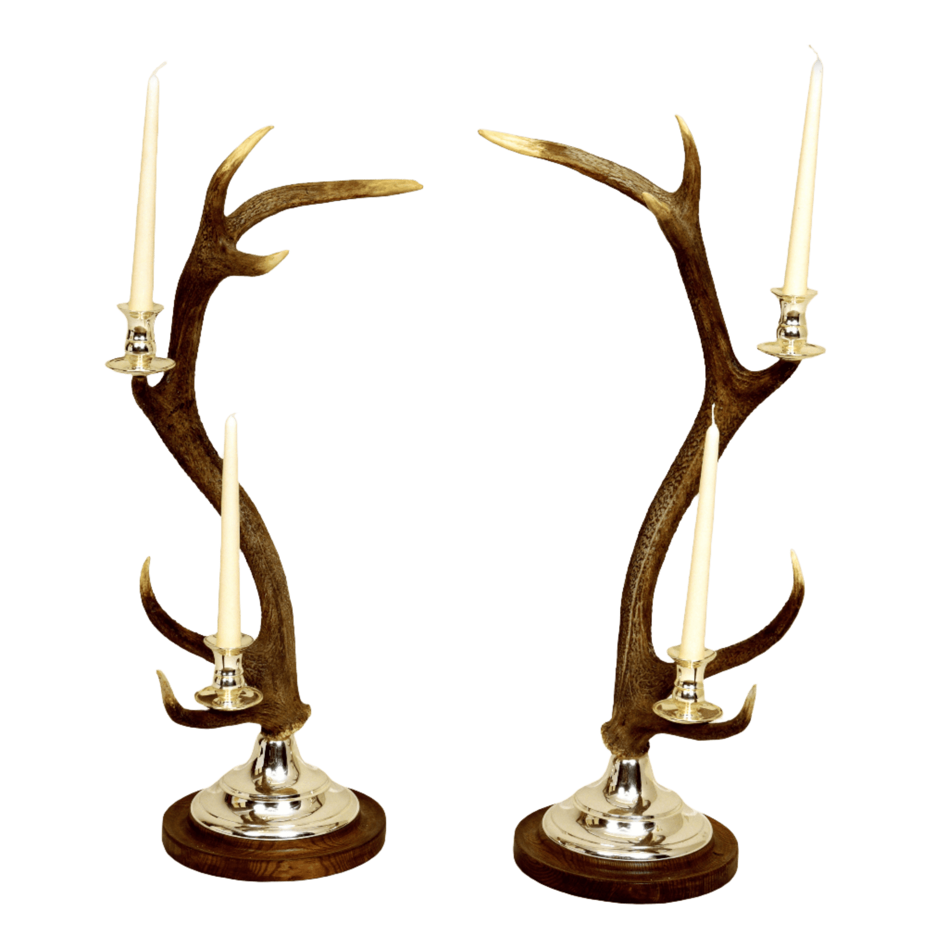 The most popular of our Antler Candlesticks, made from a pair of Red Deer Antlers with silver plated base and candle cups. No two pairs will ever be the same. These candlesticks can also be made with Antique Brass fittings. We can also do a 1 -arm version.