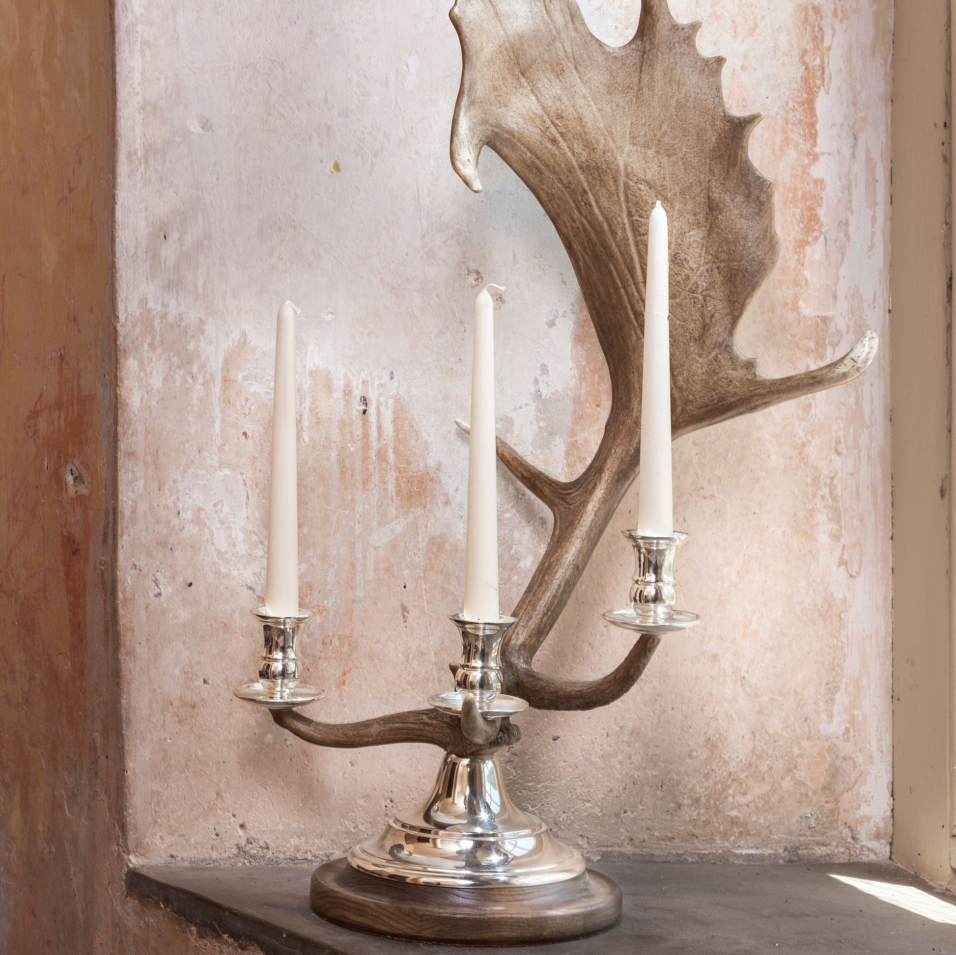 This unusual 3 -arm candlestick is made from a single Fallow Antler. Each one will be unique. The fittings are silver plate.