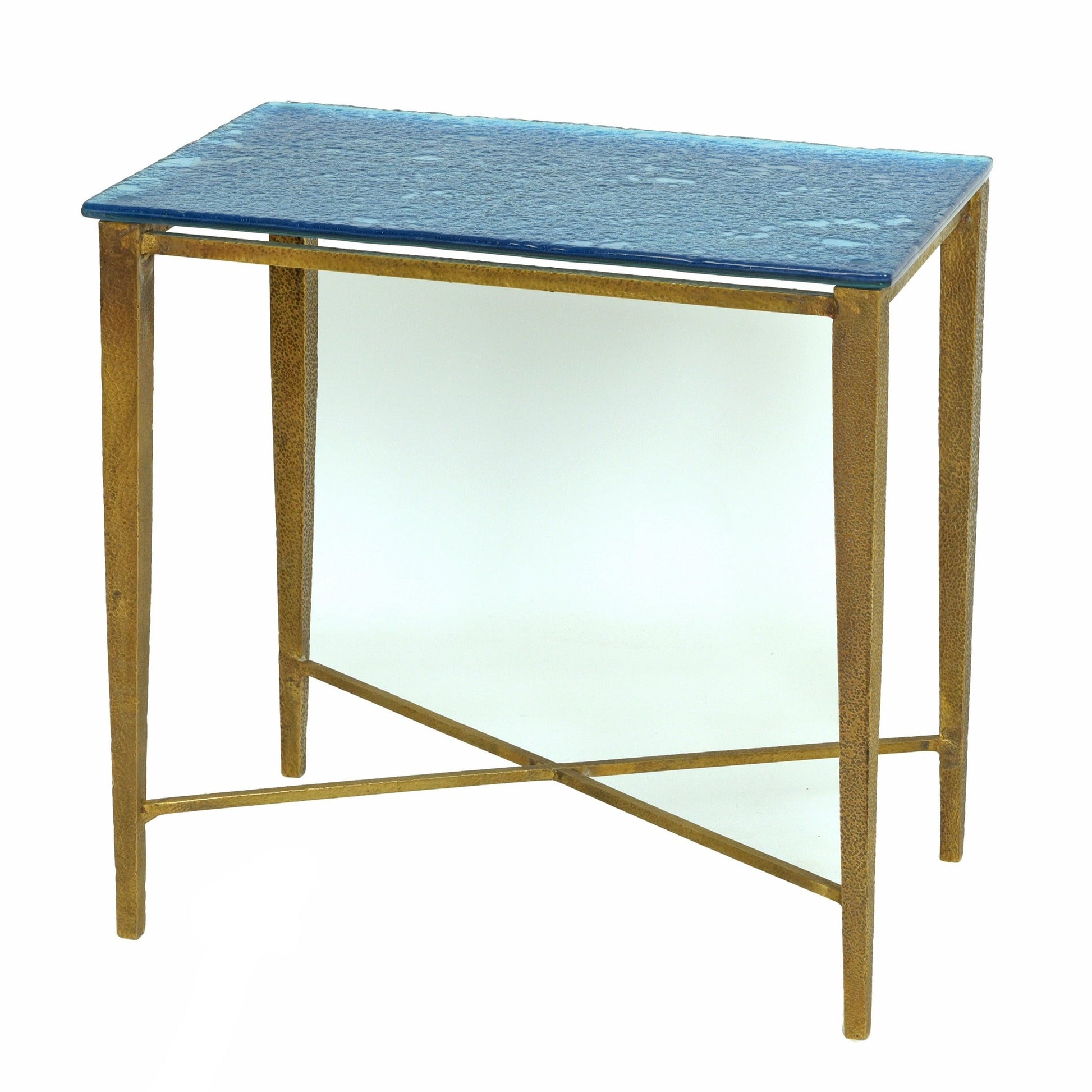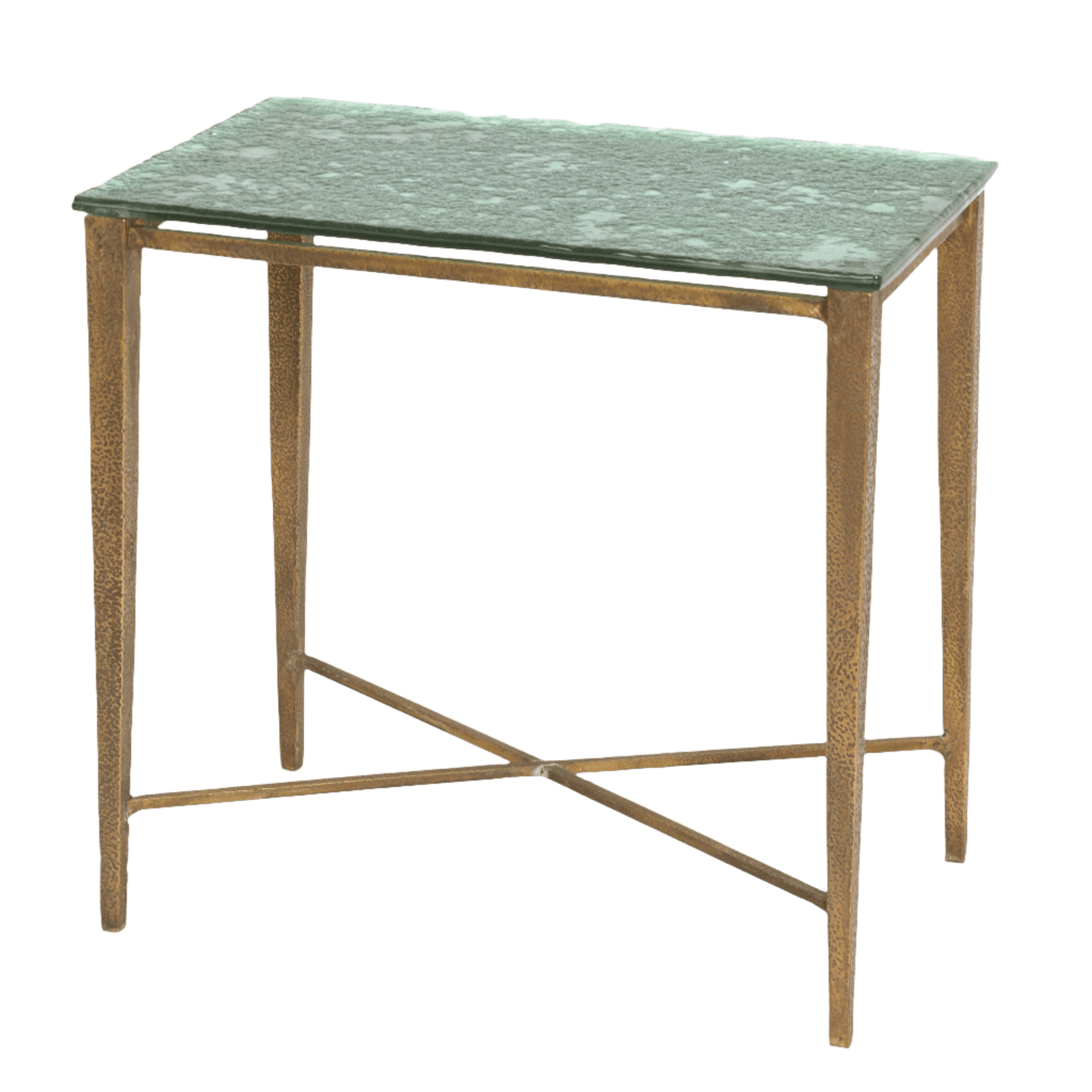 Attractive and useful side tables with beaten brass base and 13mm thick textured glass tops. The glass is available in red, blue, green and gold.