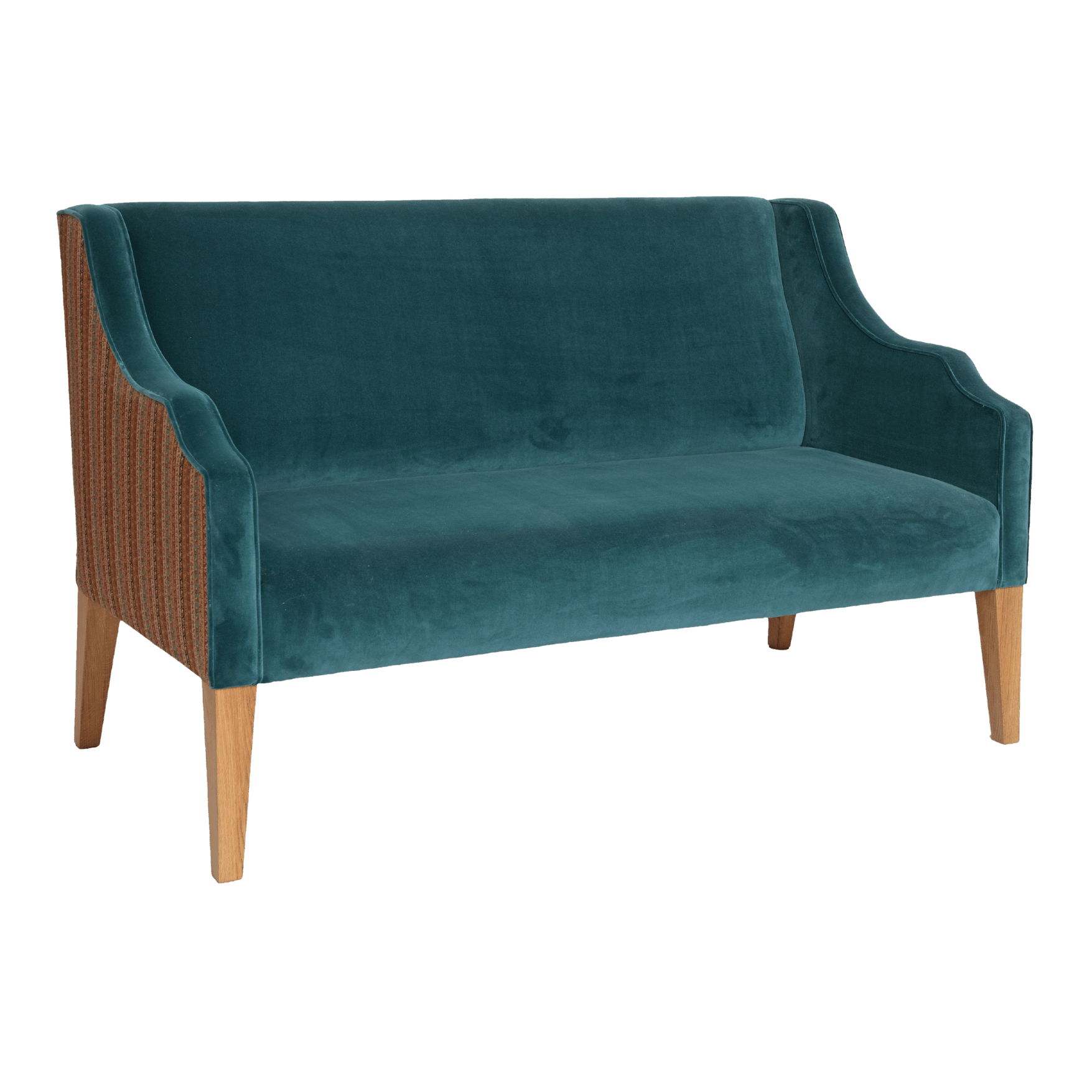 This is such a great sofa. Neat, comfortable and individual. The legs can be timber stained, or painted any colour. The shaped arms look good with a contrast pipe.