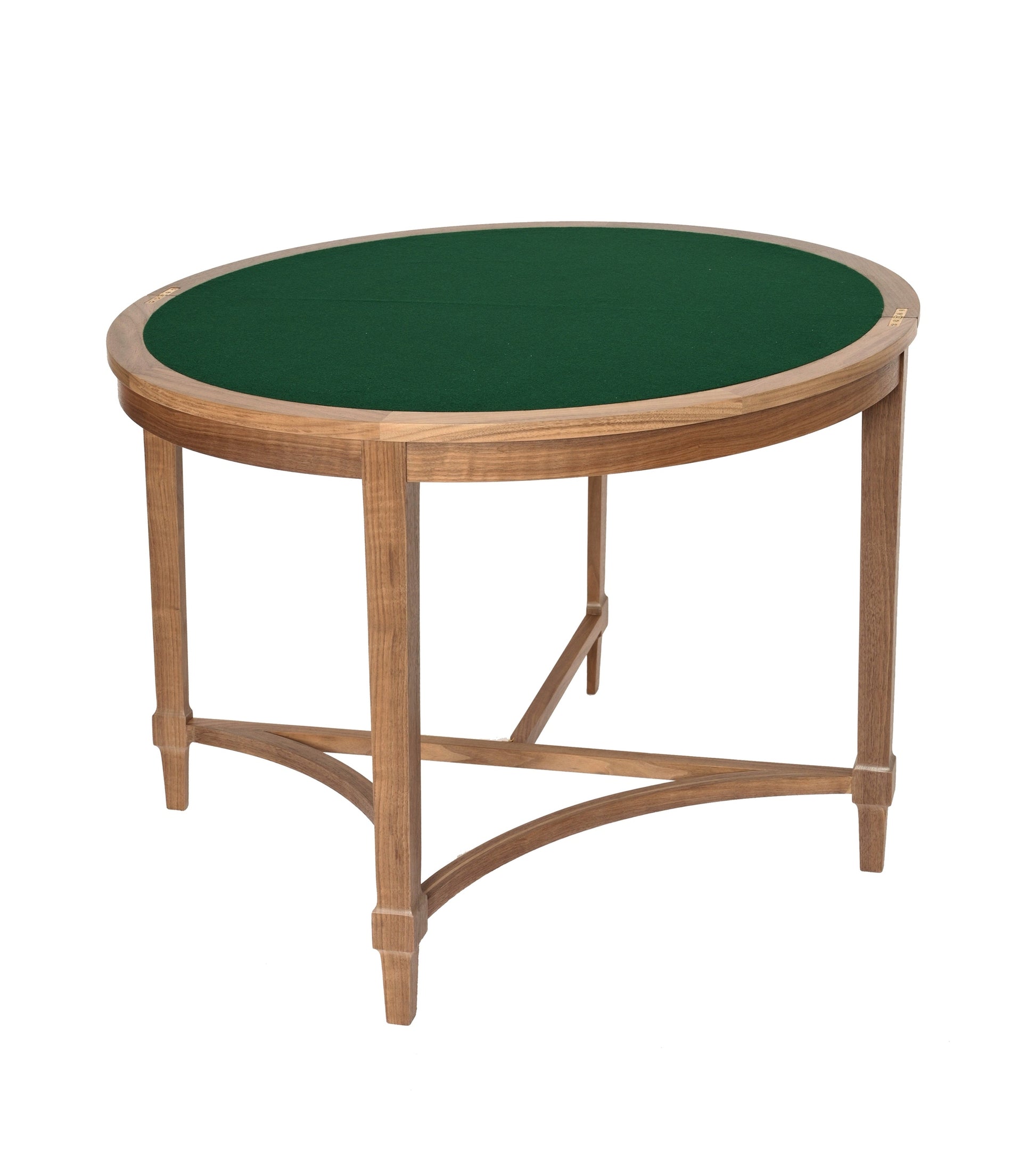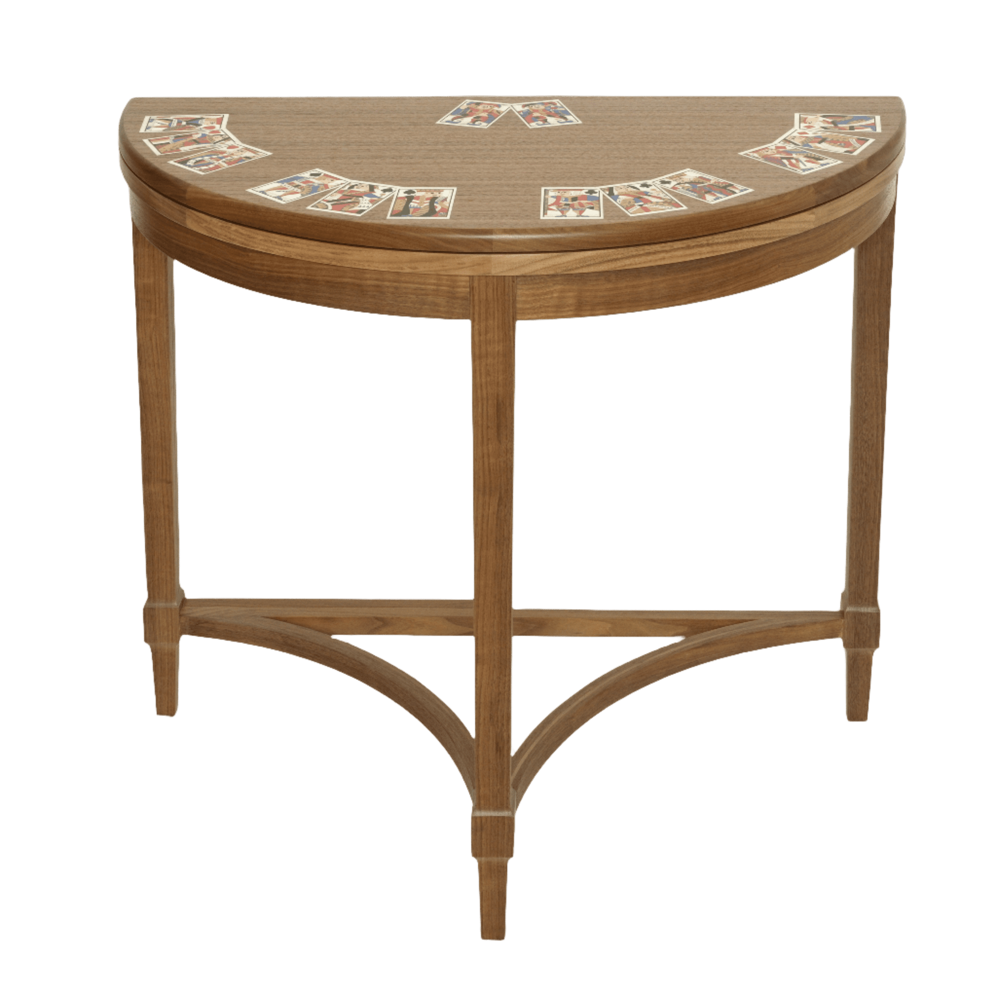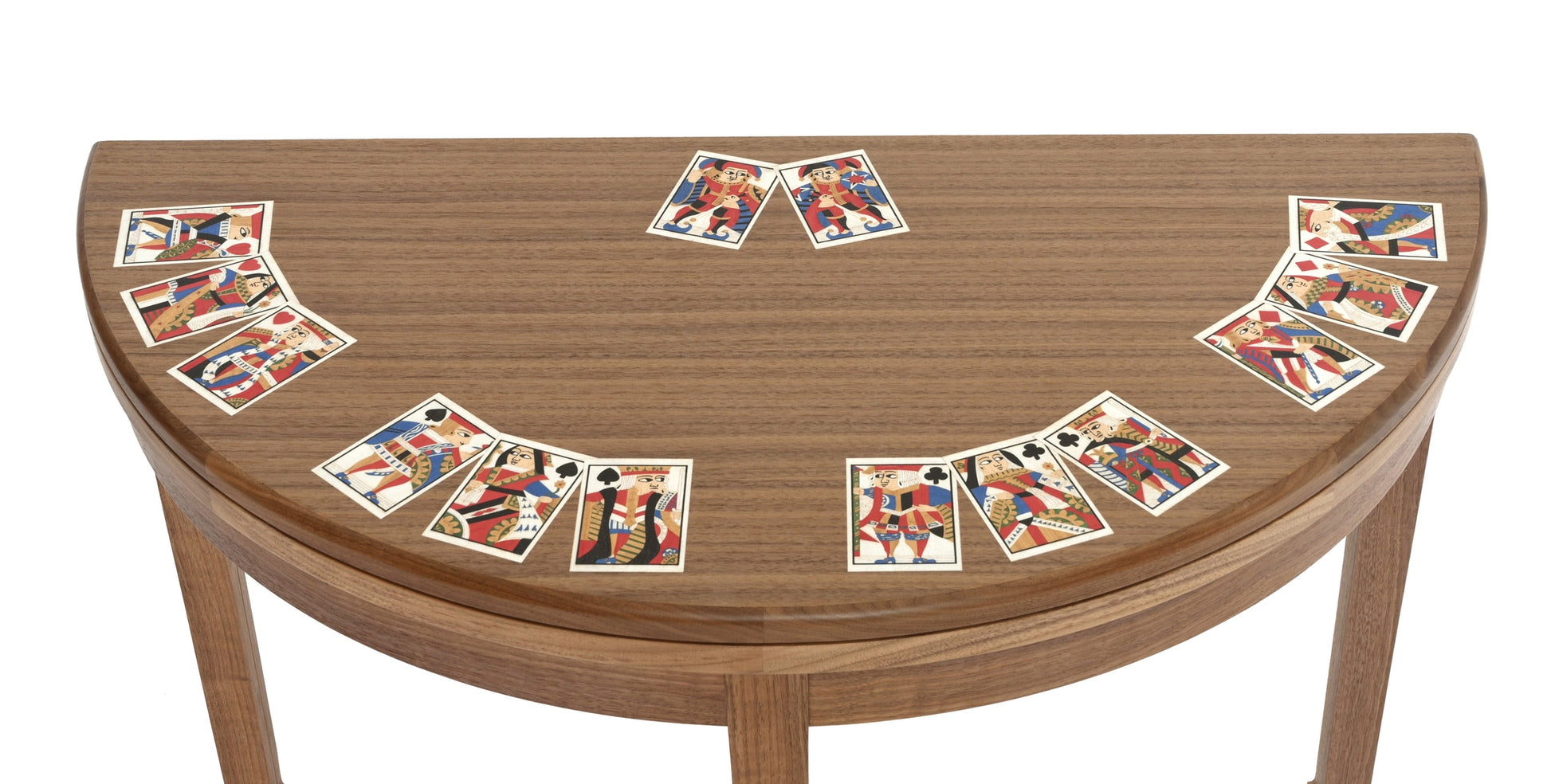 The card table is made in Walnut with marquetry inlay copied from 17th Century playing cards. This is a unique piece of furniture which illustrates the skill of our cabinet makers.