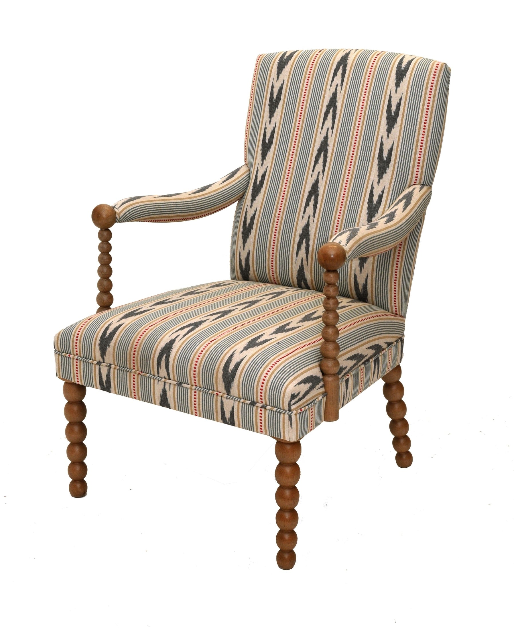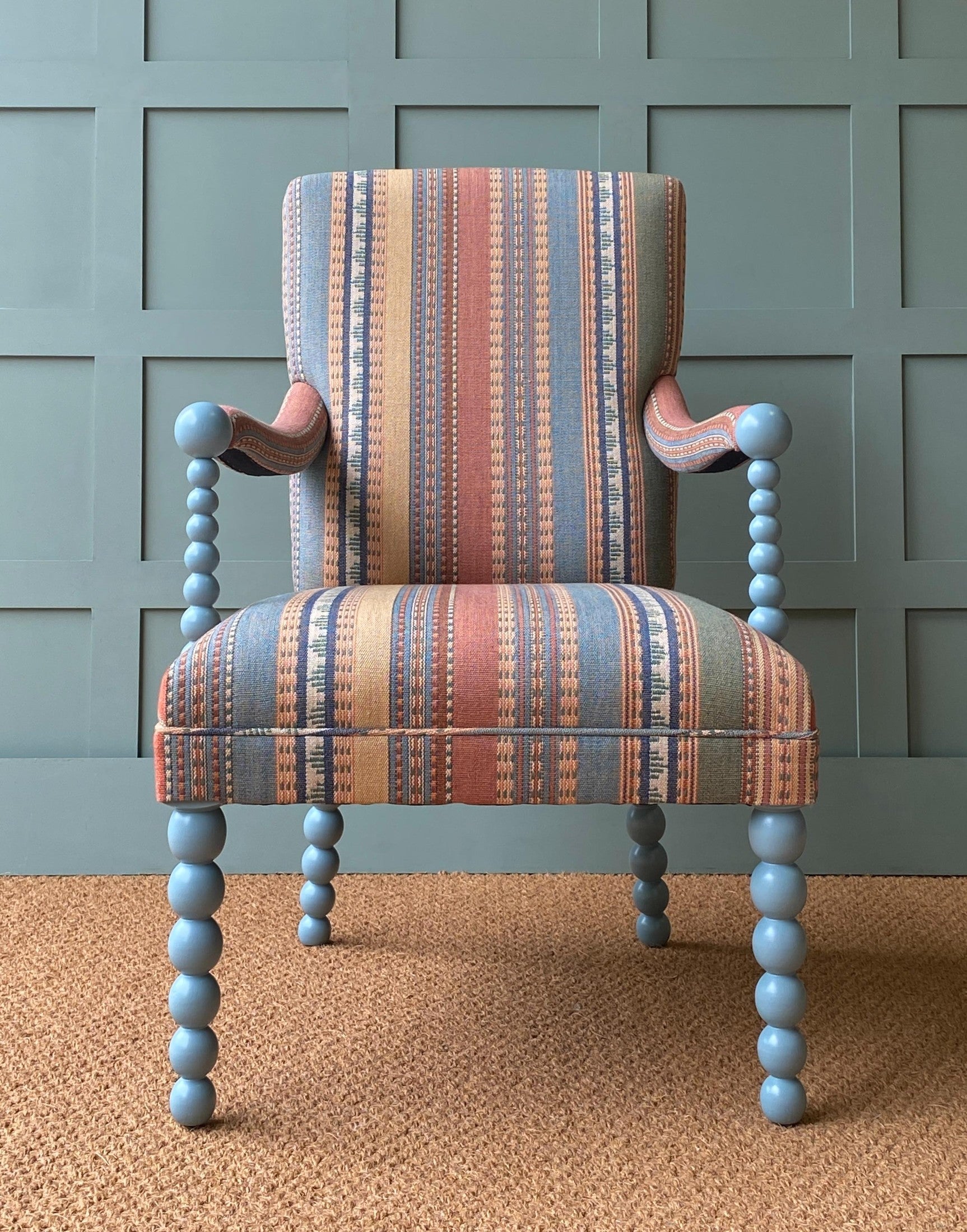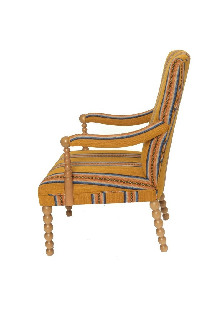 This is a great armchair. Very comfortable and a bit different. The bobbin legs and arms are turned in Beech and can be stained any colour or painted.