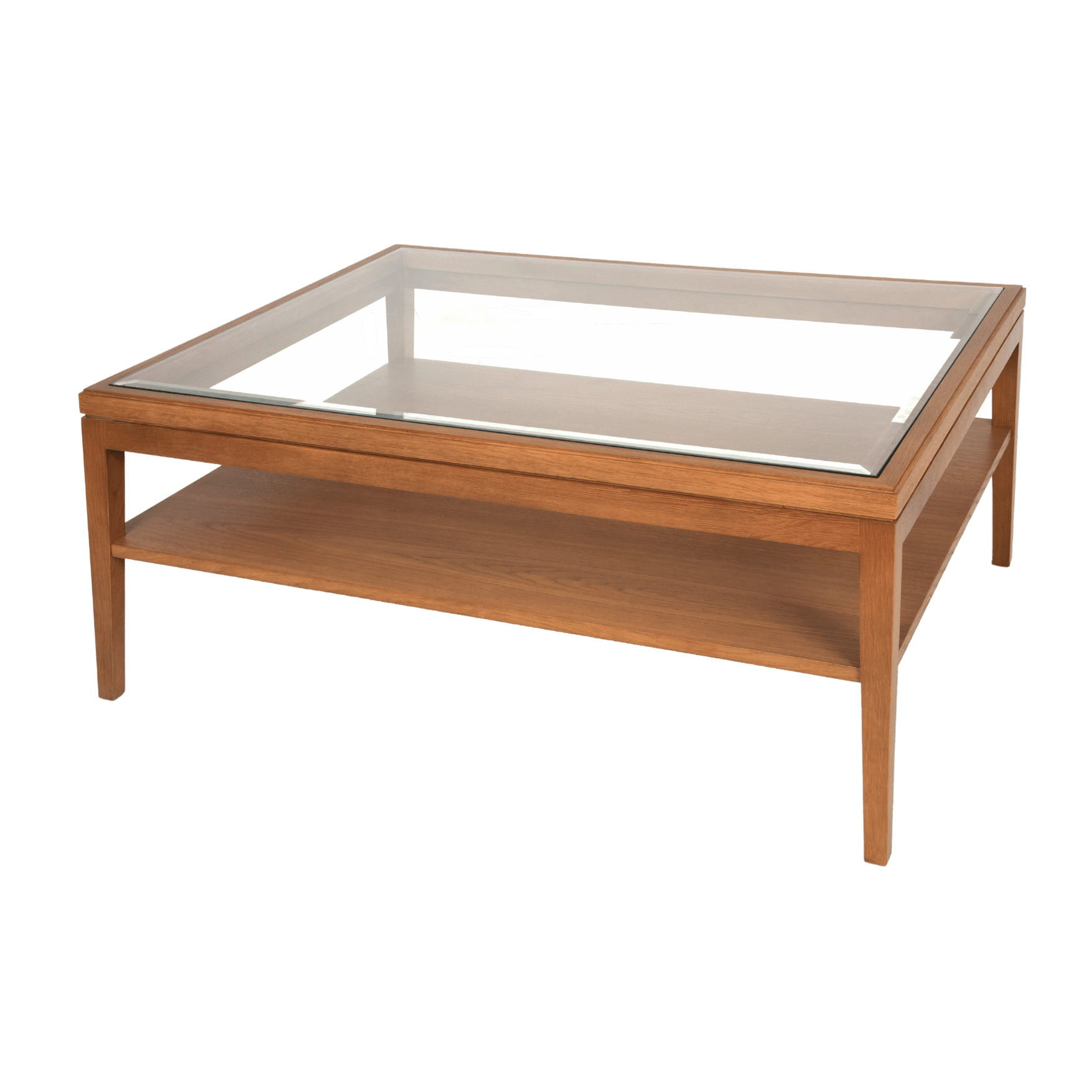 A timeless classic coffee table with inset thick glass top with bevelled edge. Made in oak, it can be stained darker if required. Other sizes to order
