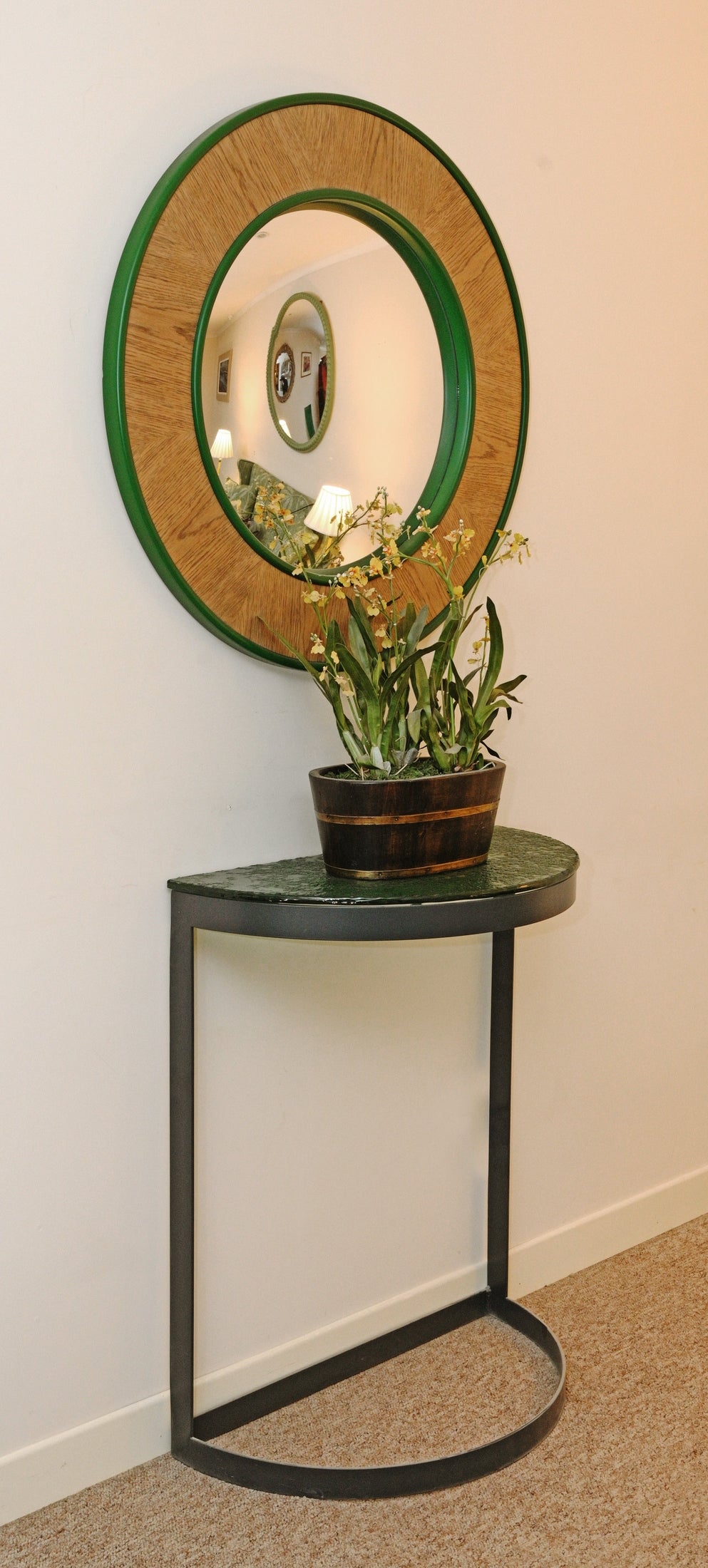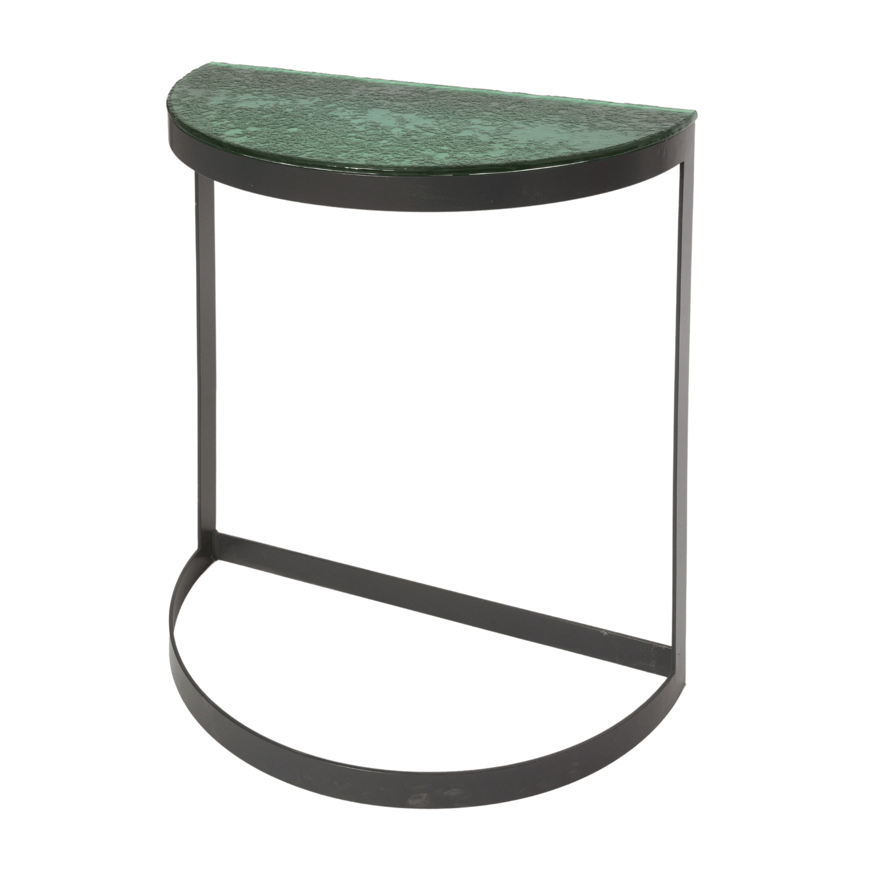 Thick textured glass from Morocco makes an interesting top to this metal demi-lune table.