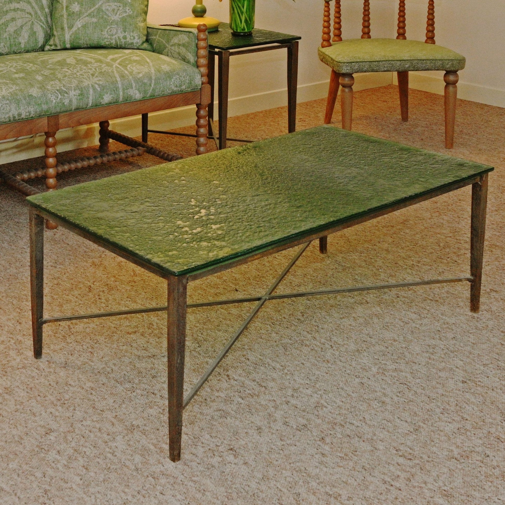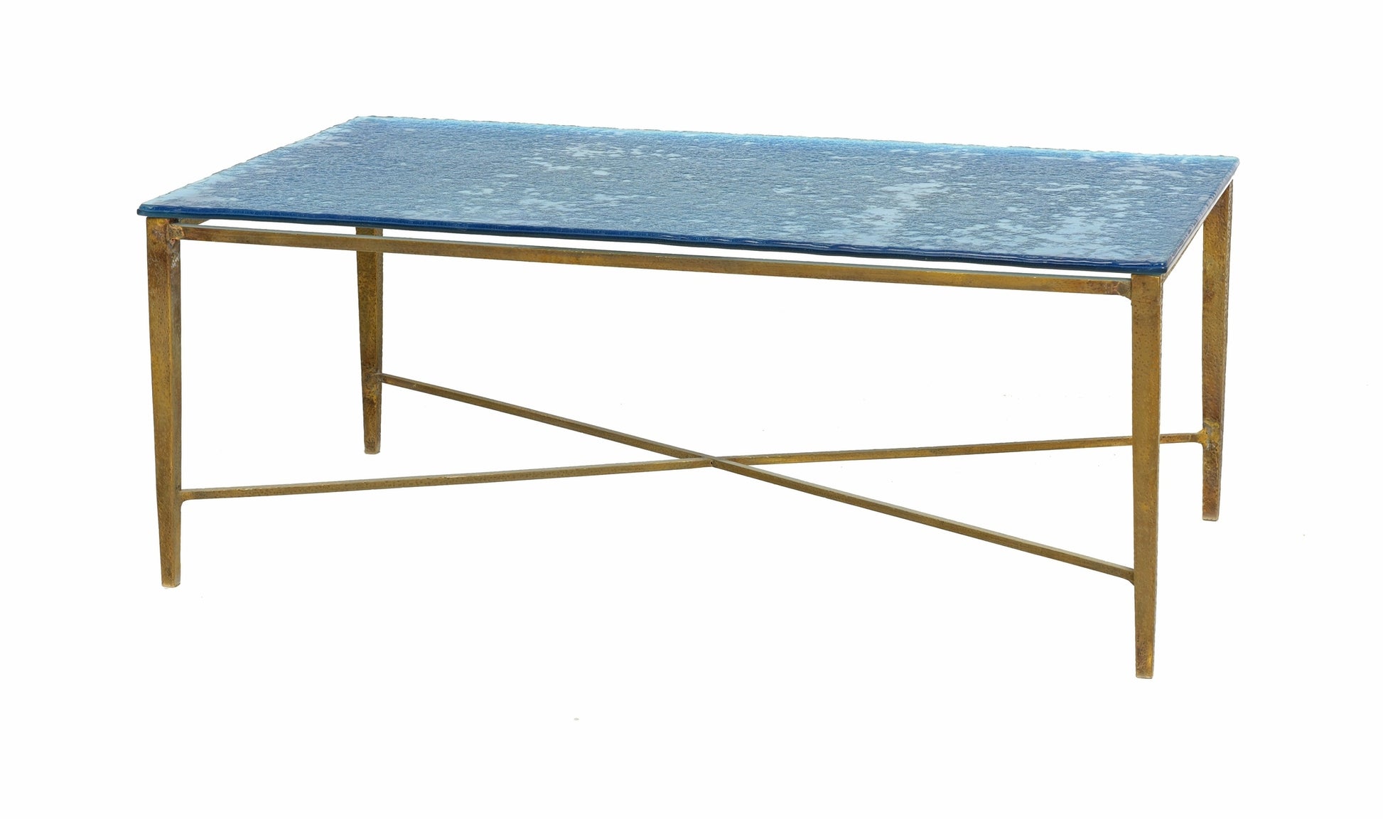 An interesting stylish coffee table with hammered antiqued brass base & a thick glass top. The glass is 13mm thick and is textured on one side and smooth on the other. It comes in green, blue, red & gold.