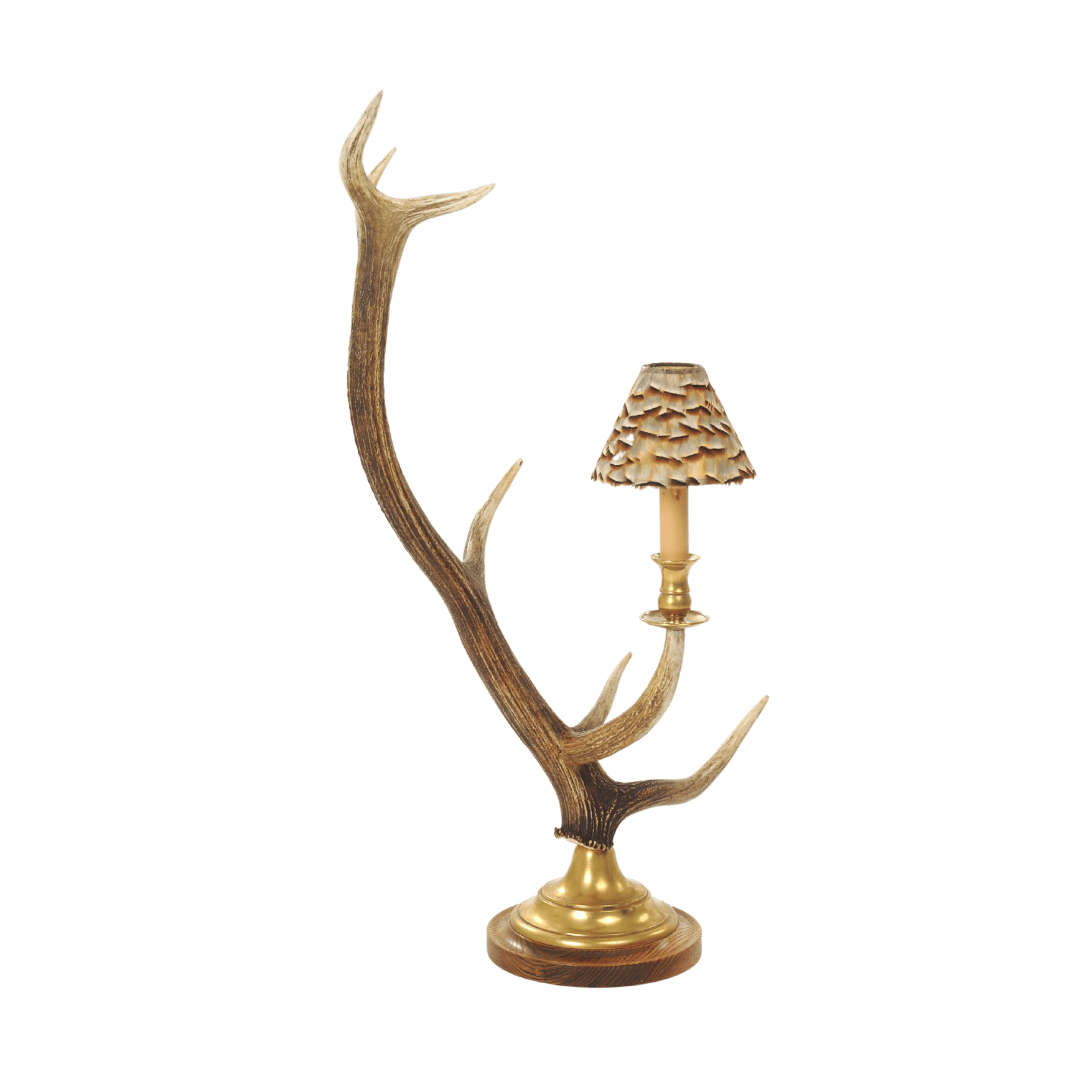 The natural curve of a Red Deer Antler makes a very attractive lamp. The fittings can be silver plate or antique brass. The partridge feather shade is optional.