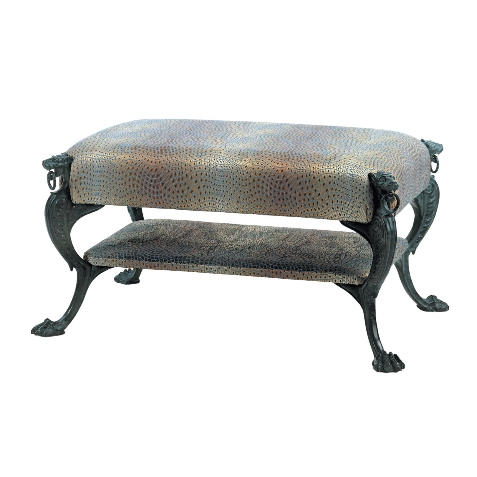 This unusual style of stool is made with legs copied from an antique fire dog. The solid brass legs are available in shiny or antique brass, or with a verdigris finish. Any size to order.