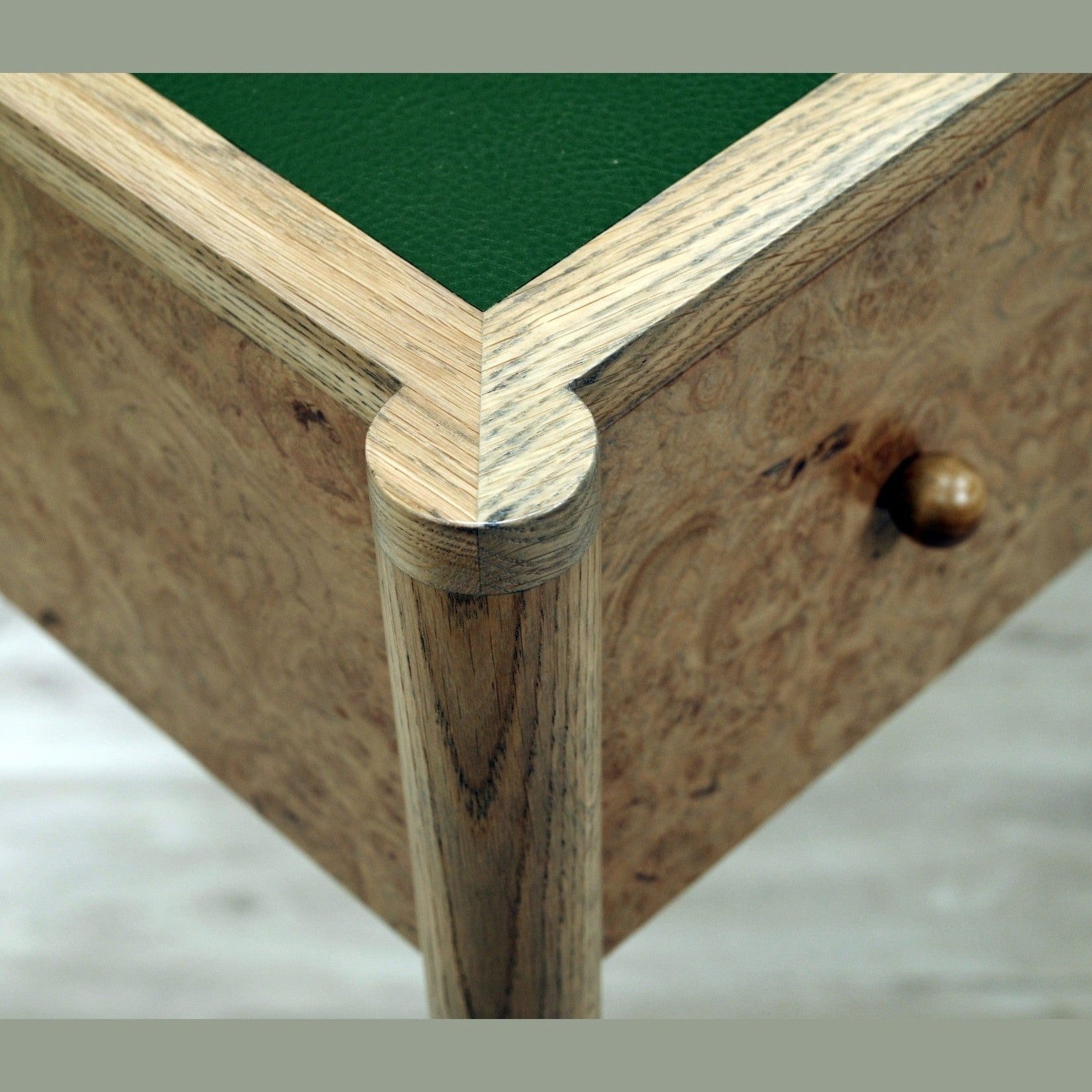 A contemporary desk with finesse. Tapered round legs meet burr oak on the drawer and table sides. Soft close runners ensure smooth drawer closure. Finished with a leather top inset.