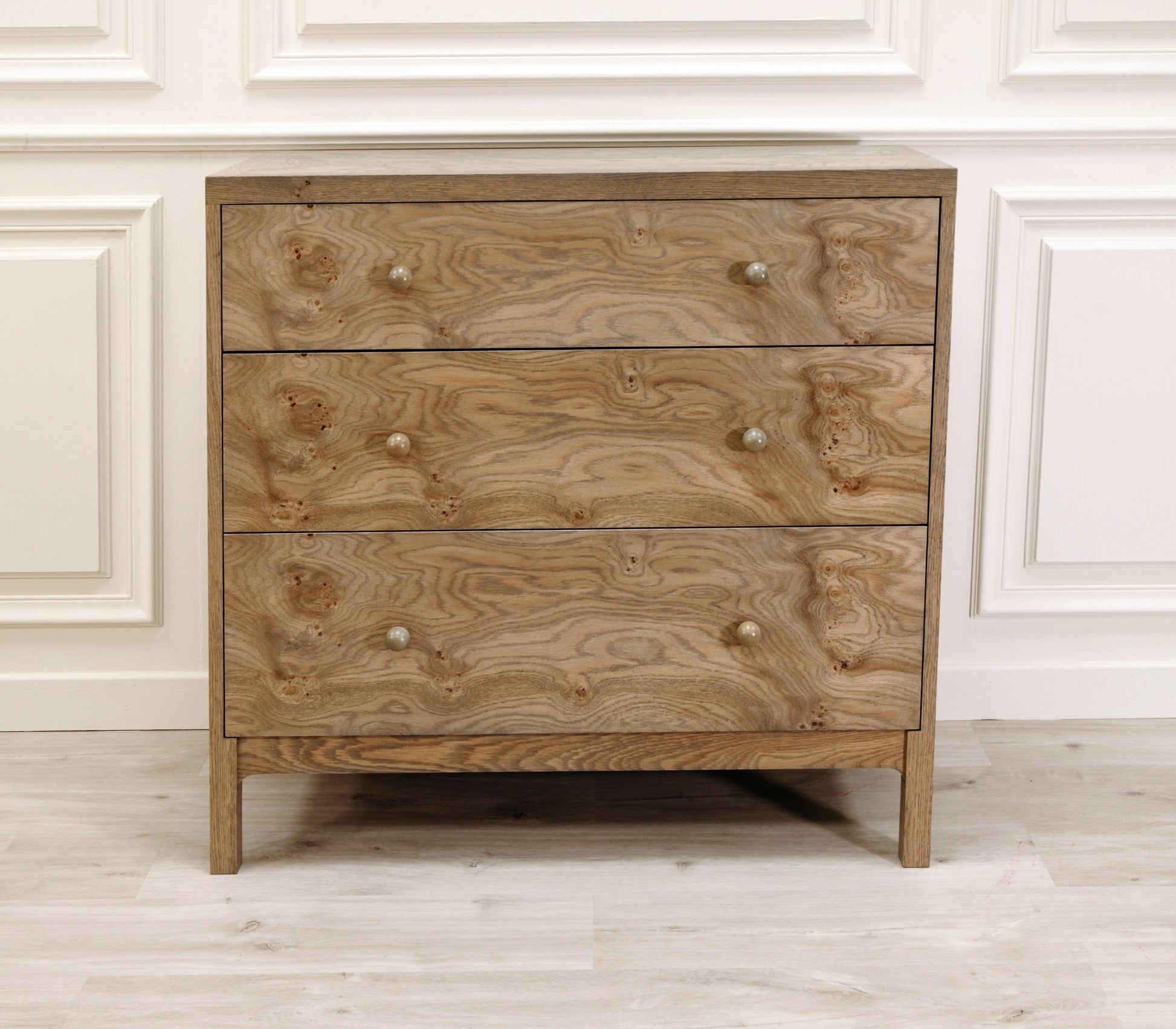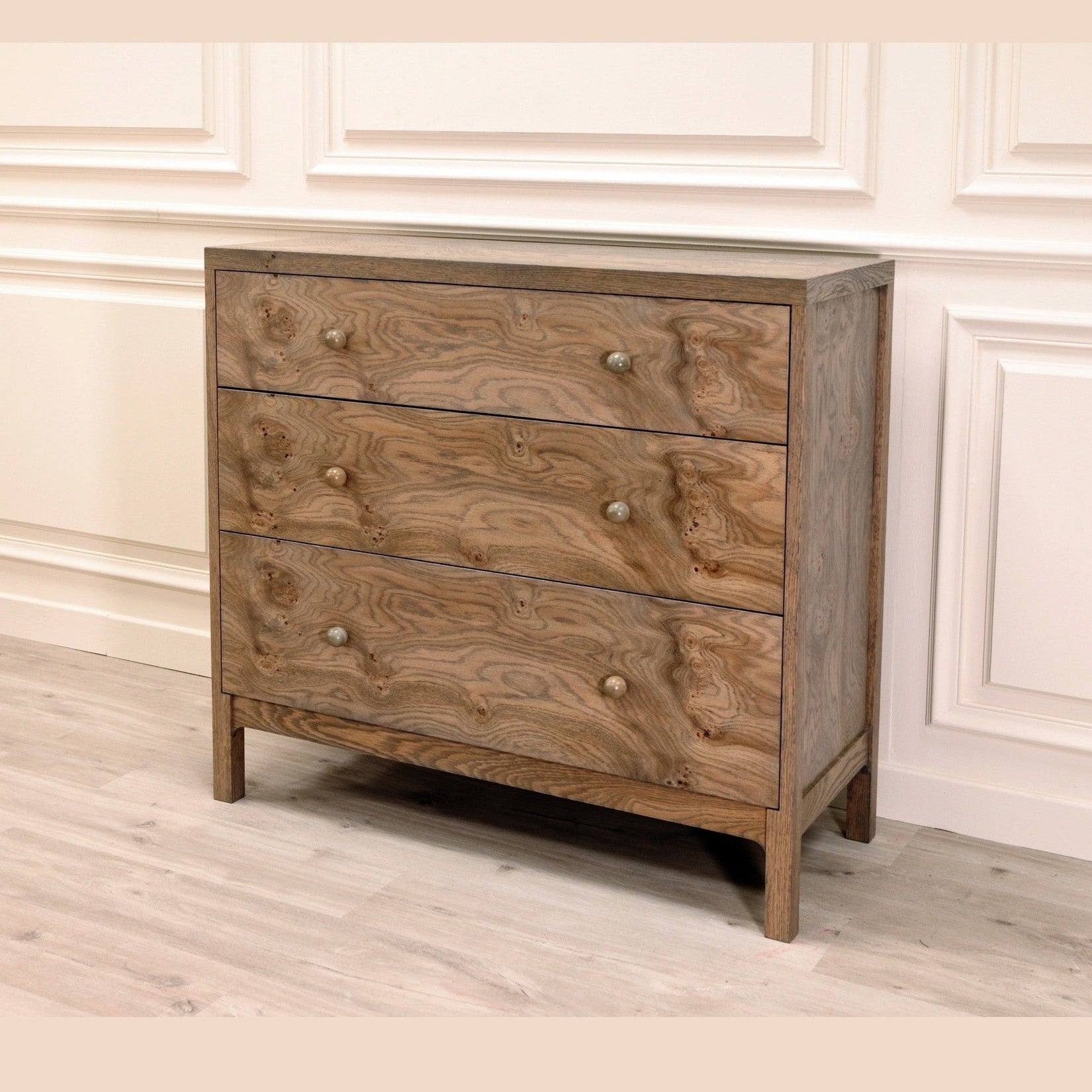 A sleek and modern chest covered in a burr and pippy oak veneer.