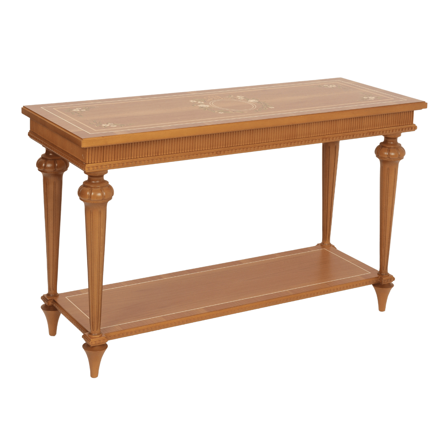 This bright & fresh collection of furniture is decorated with matching marquetry designs set into a cherry wood background. The attractive console table would fit into a hall or living room.