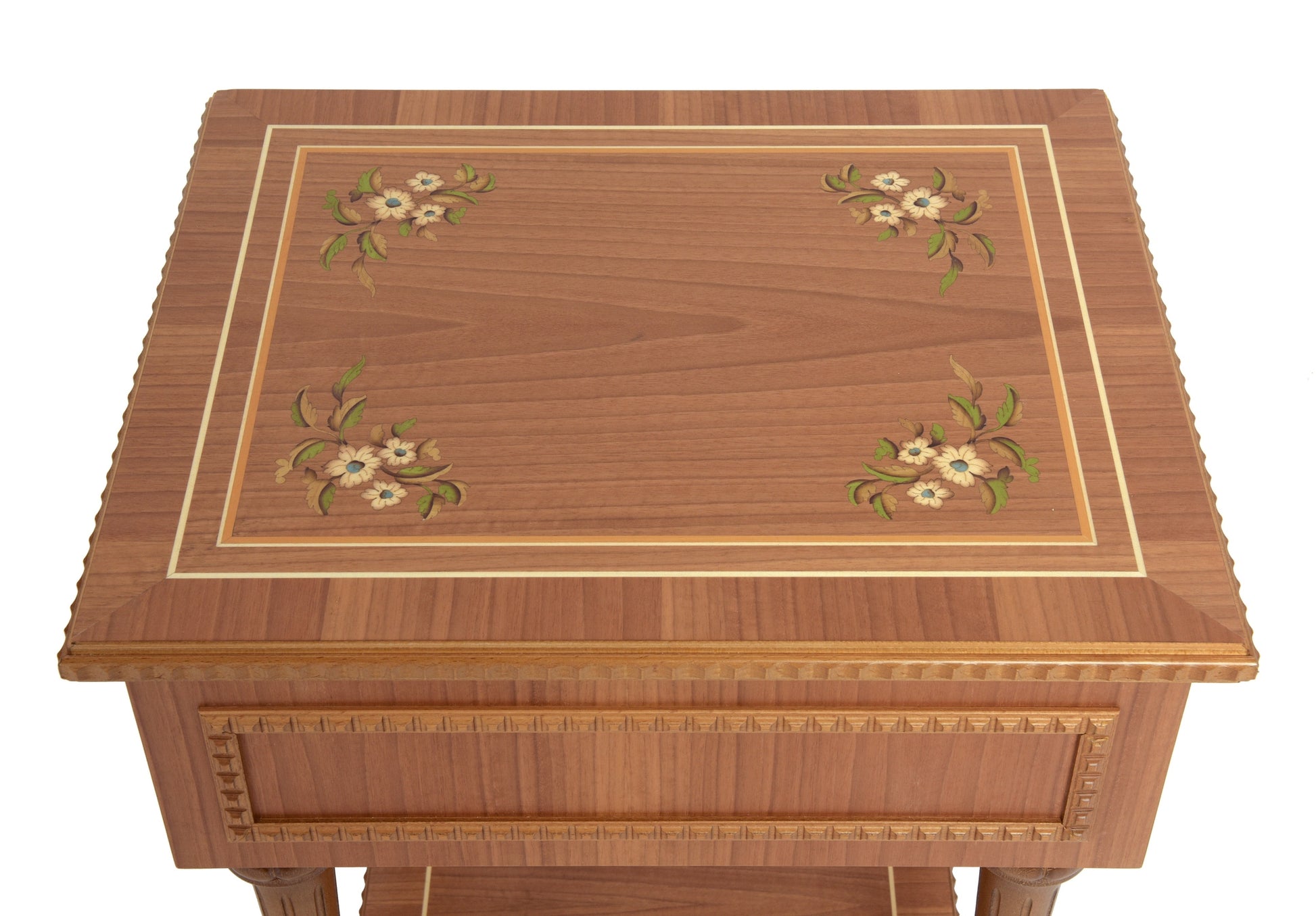 This bright & fresh collection of furniture is decorated with matching marquetry designs set into a cherry wood background. The side table has an opening drawer and shelf. Perfect either as a bedside table or in a living room.