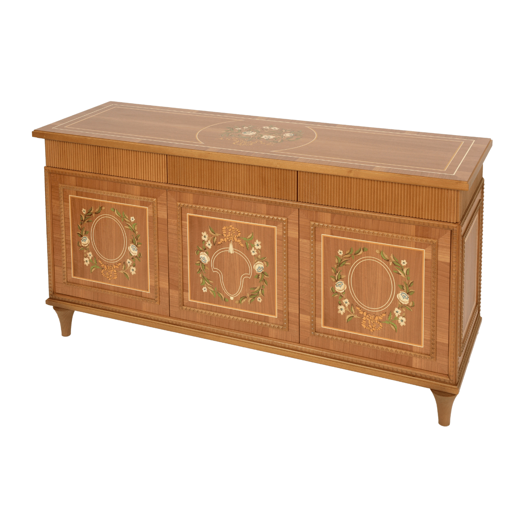 This bright & fresh collection of furniture is decorated with matching marquetry designs set into a cherry wood background. This storage cabinet with has three drawers and three cupboard doors with adjustable shelves for storage.
