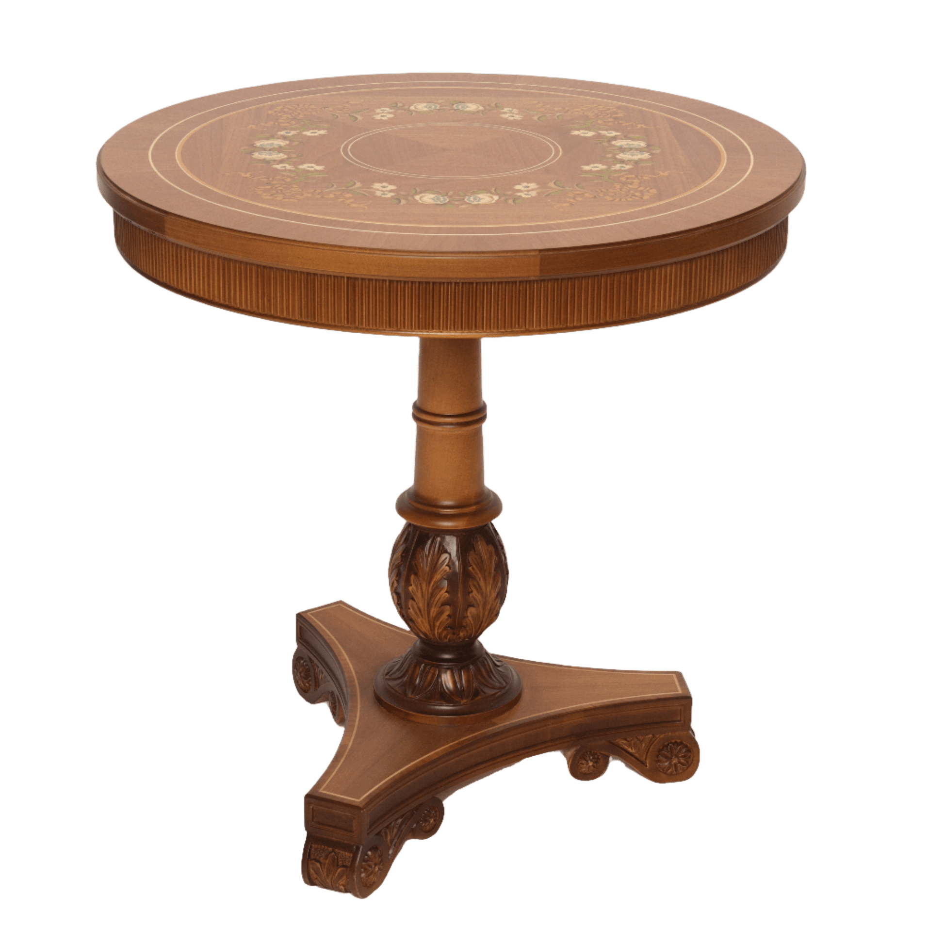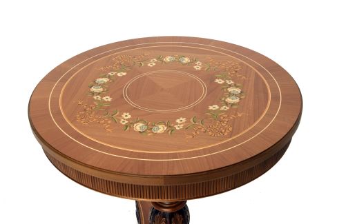 This bright & fresh collection of furniture is decorated with matching marquetry designs set into a cherry wood background. This round side table has a carved pedestal leg and ribbed frieze detail round the top.