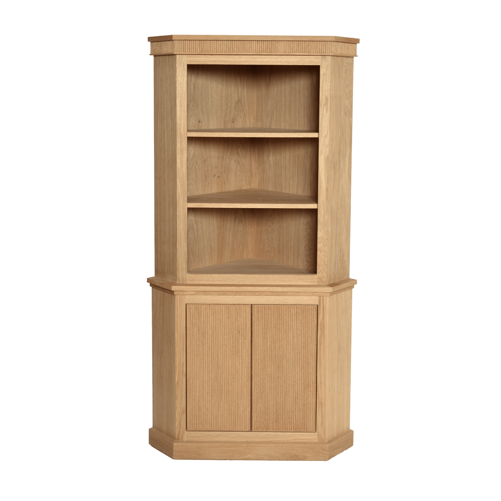 This Corner Cabinet has ribbing detail on the doors and front facing which is an interesting feature of this cabinet. It is made in oak but can also be painted any colour.