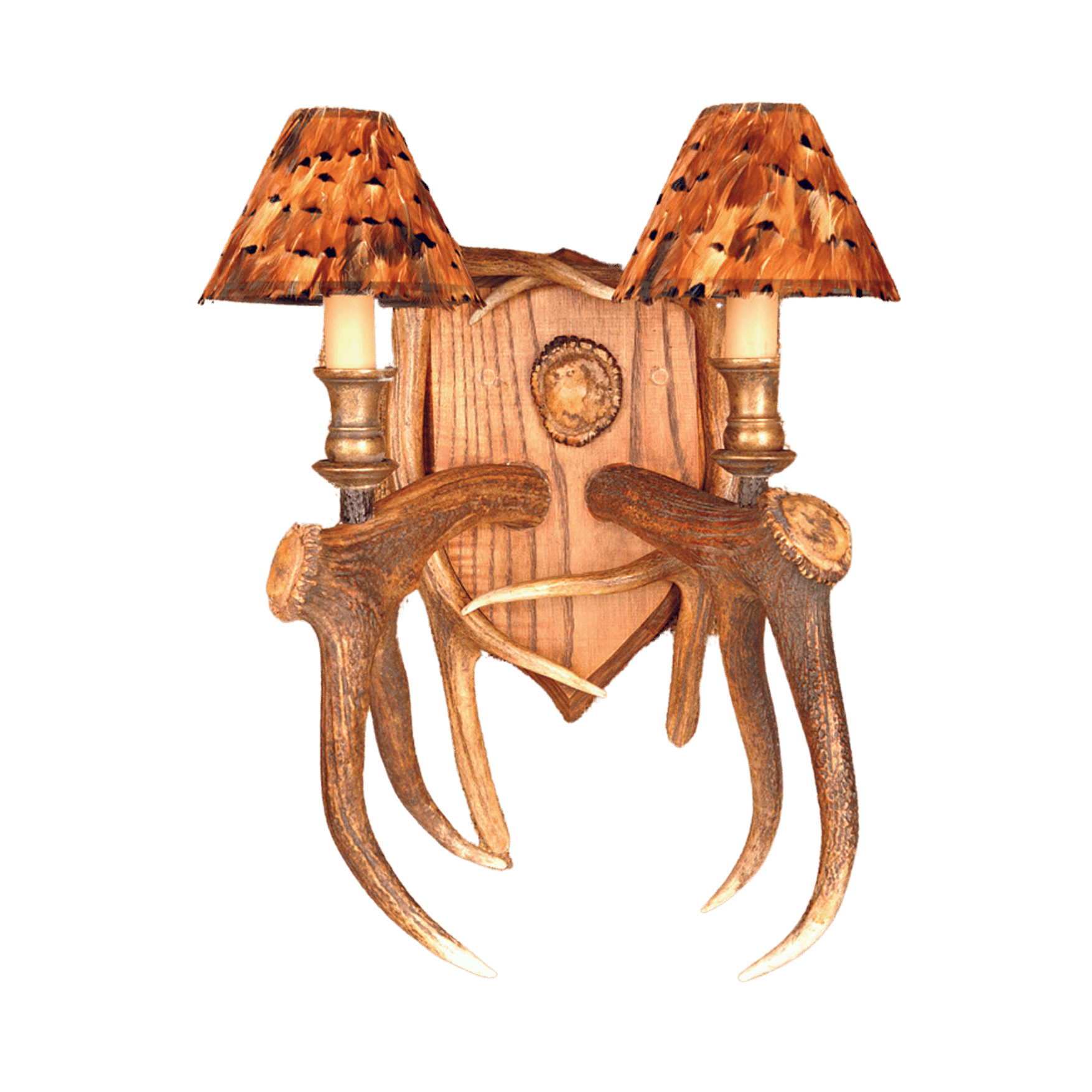 Red Deer antlers are used to make these distinctive sconces. The shield-shaped backs are made from Ash and can be stained any colour. Also available with1 light. Feather shades are optional.