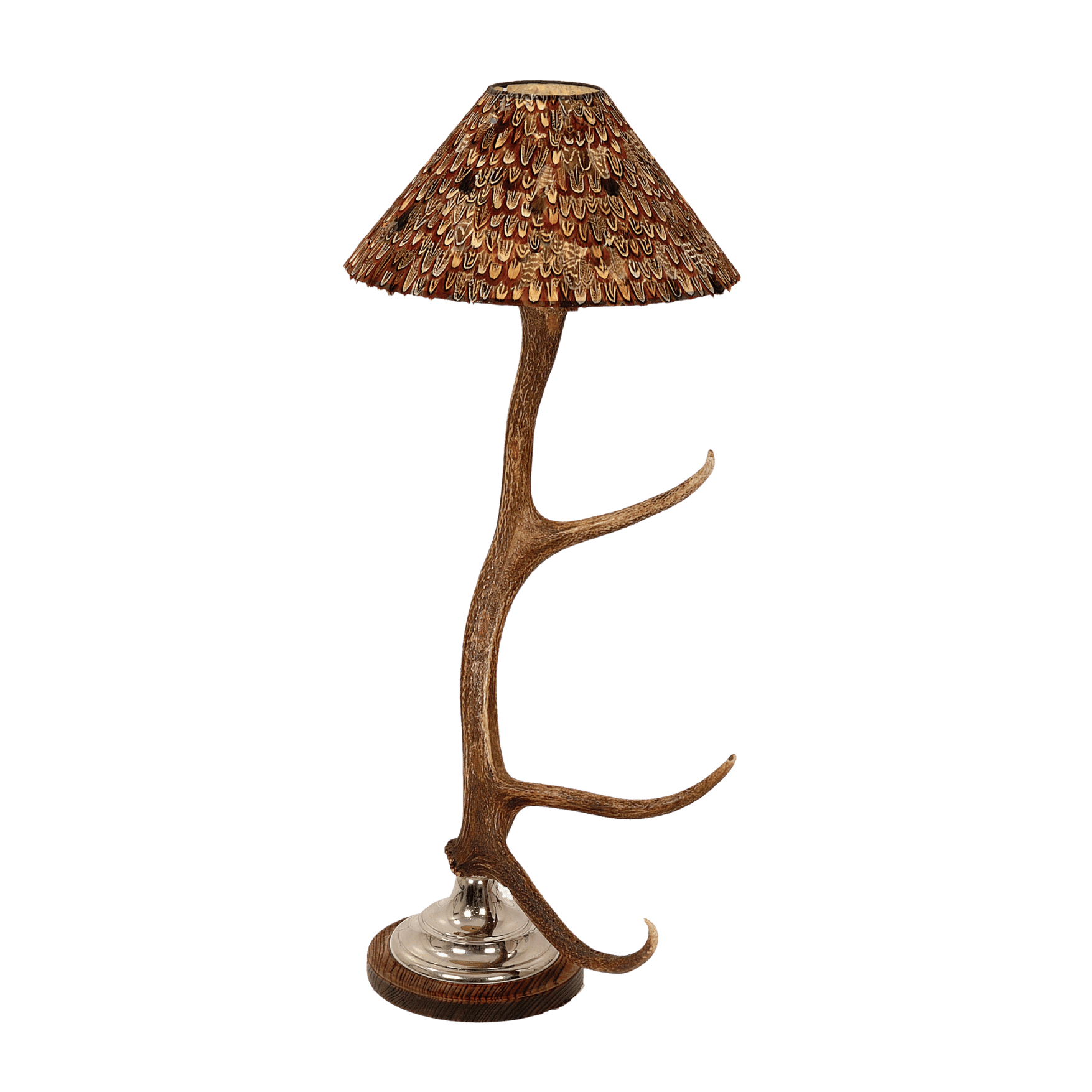 This is our best selling lamp with a design that doesn't detract from the natural shape of the Antler. The pheasant feather lampshade is optional.