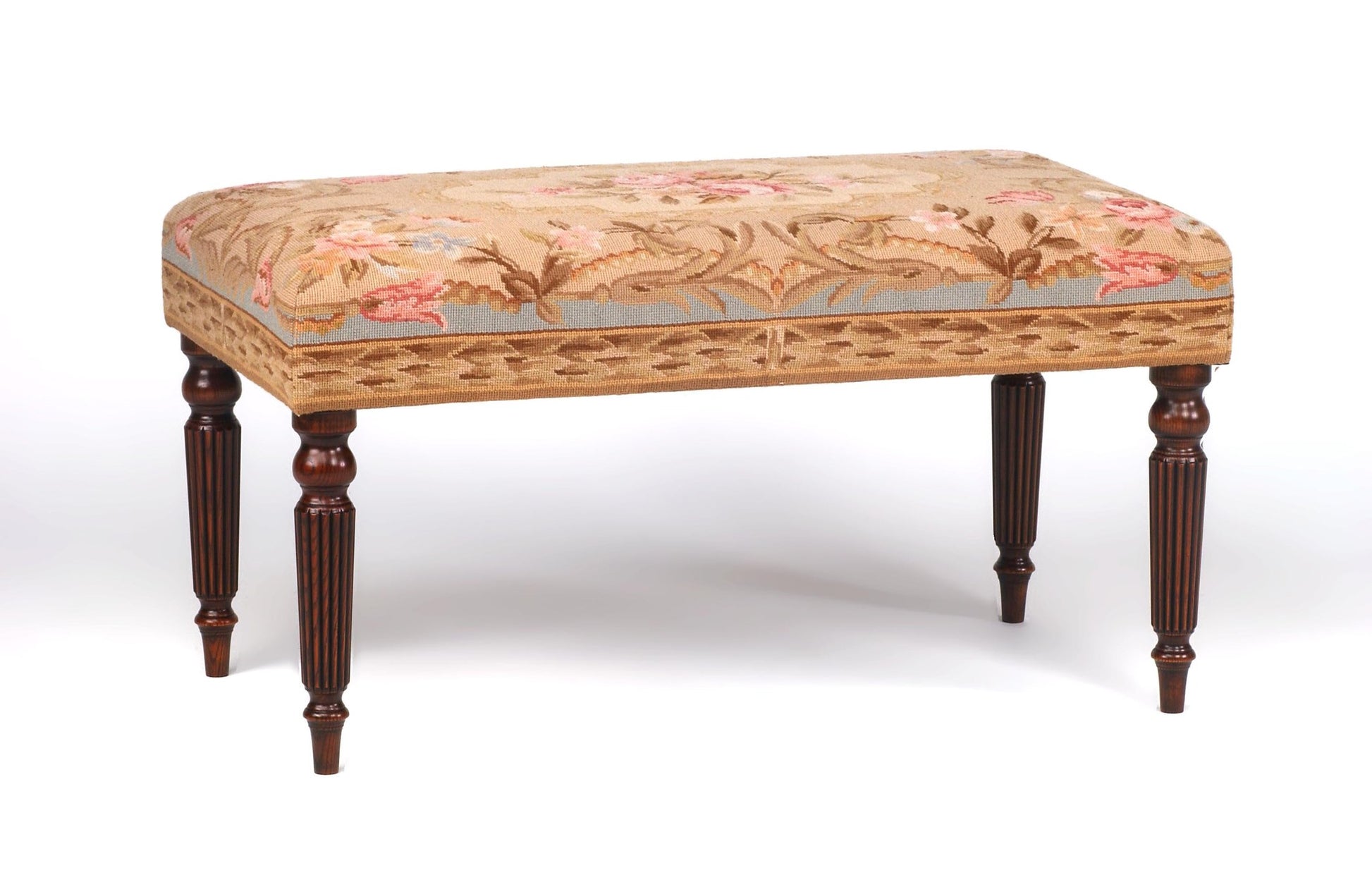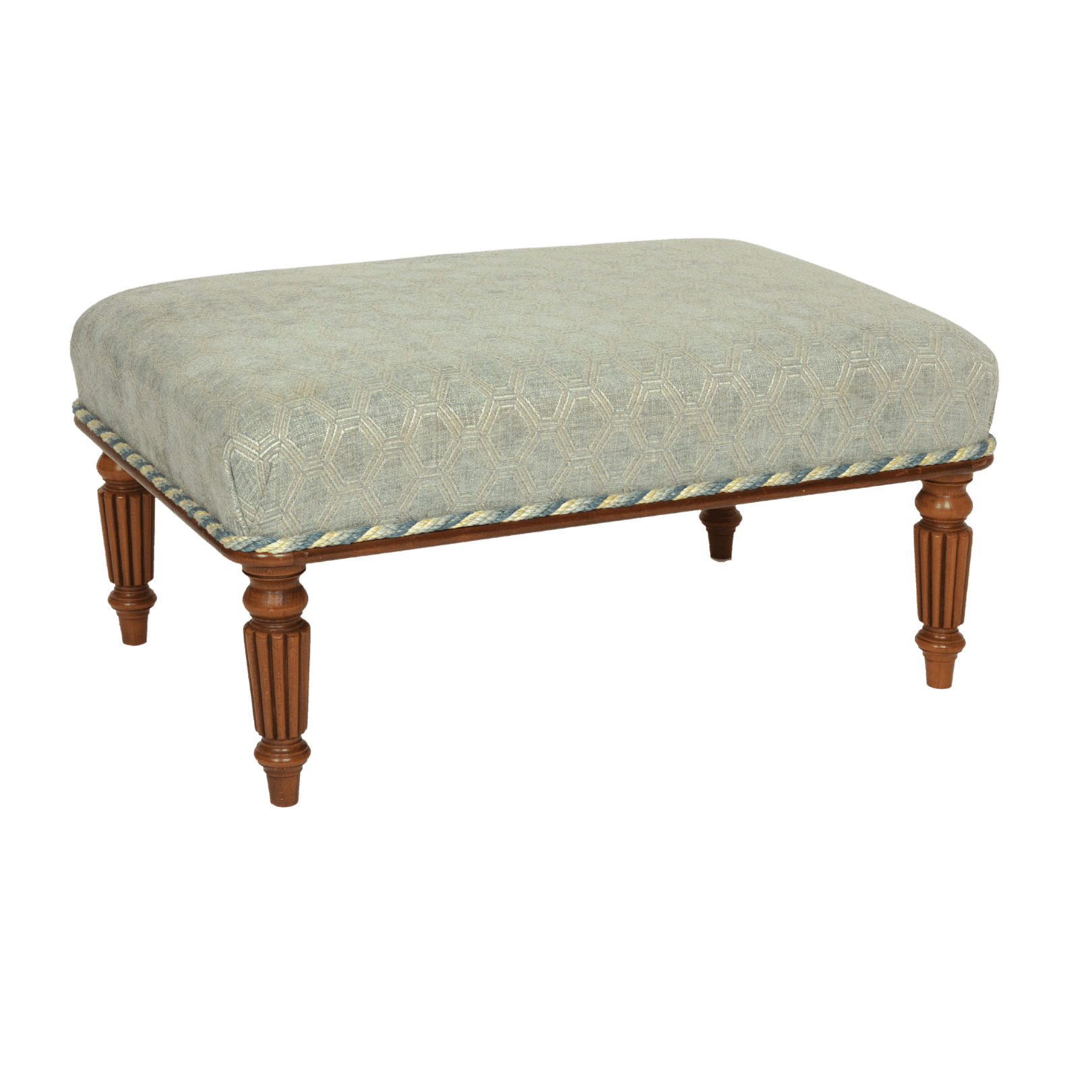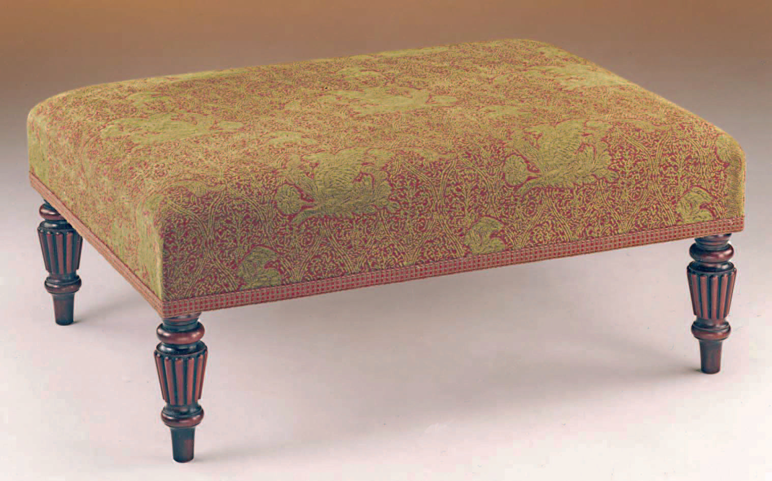 The 'Tyninghame' range refers to all our stools made with turned legs. The stool can have a plain upholstered finish, or, as in this image, can have a wooden 'beaded edge' round the bottom.